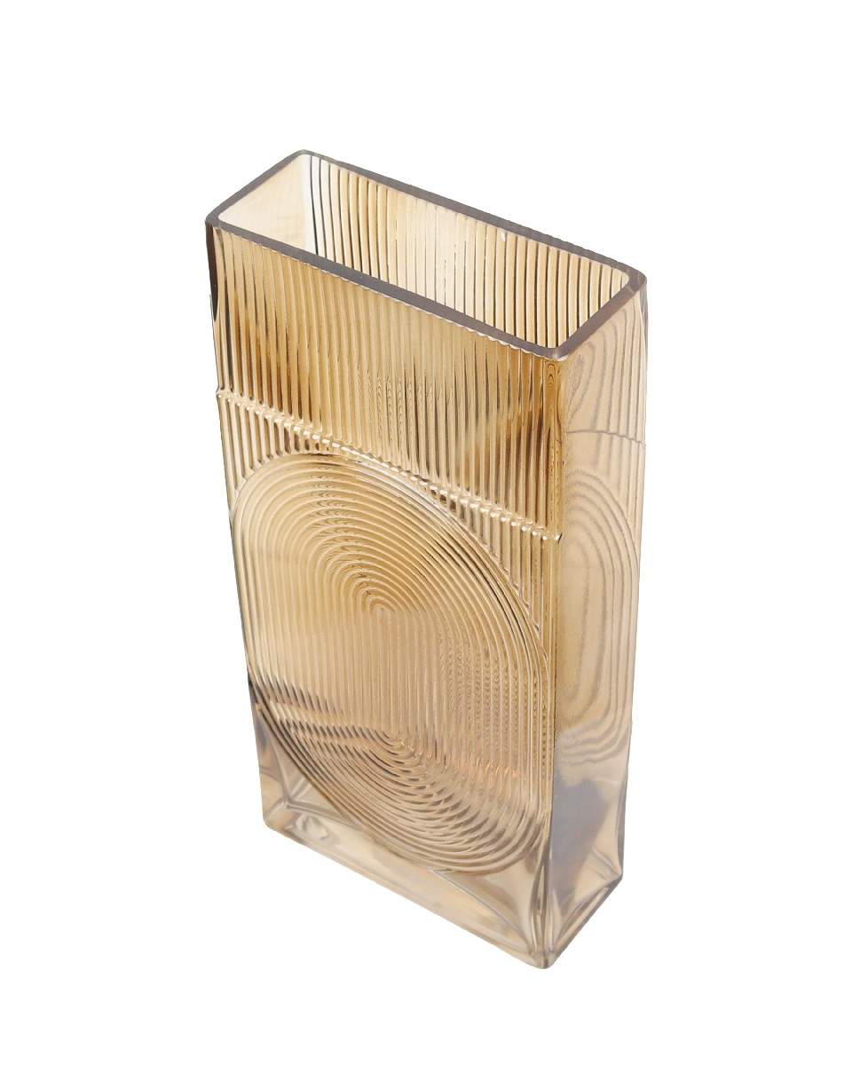 Warm amber-tinted rectangular vase with fine vertical ribbing and a striking concentric arch texture on the front. A bold, modern statement piece with retro-inspired elegance.