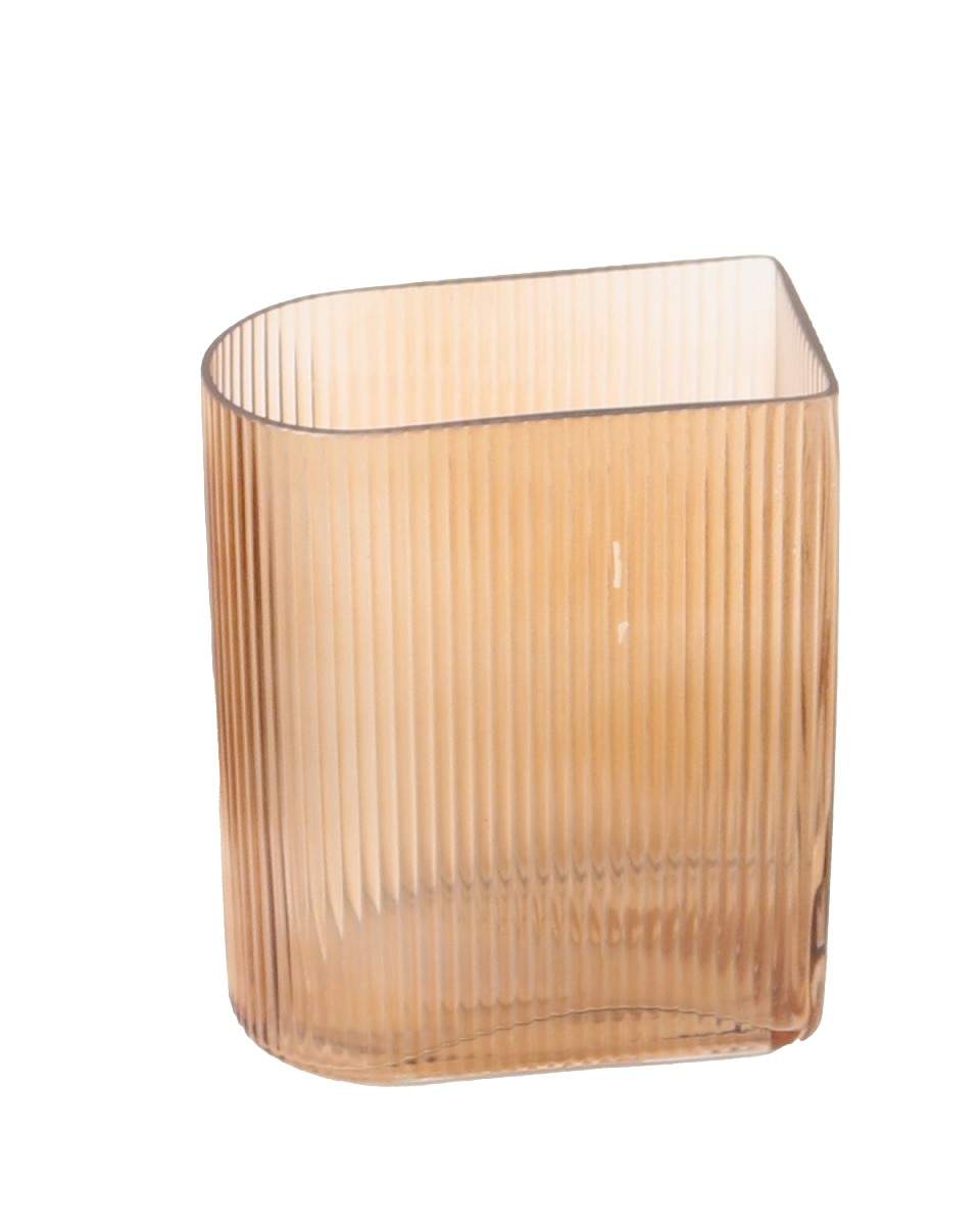 Warm amber-tinted glass vase with vertical ribbing and a sleek, modern half-oval shape. A stylish, contemporary accent perfect for small arrangements or as a standalone decorative piece.