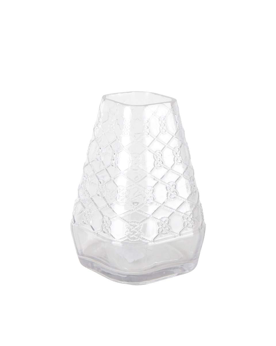 Compact, angular clear glass vase with a striking raised honeycomb pattern and softly flared rim. A modern, textured piece ideal for small bouquets or minimalist decor.