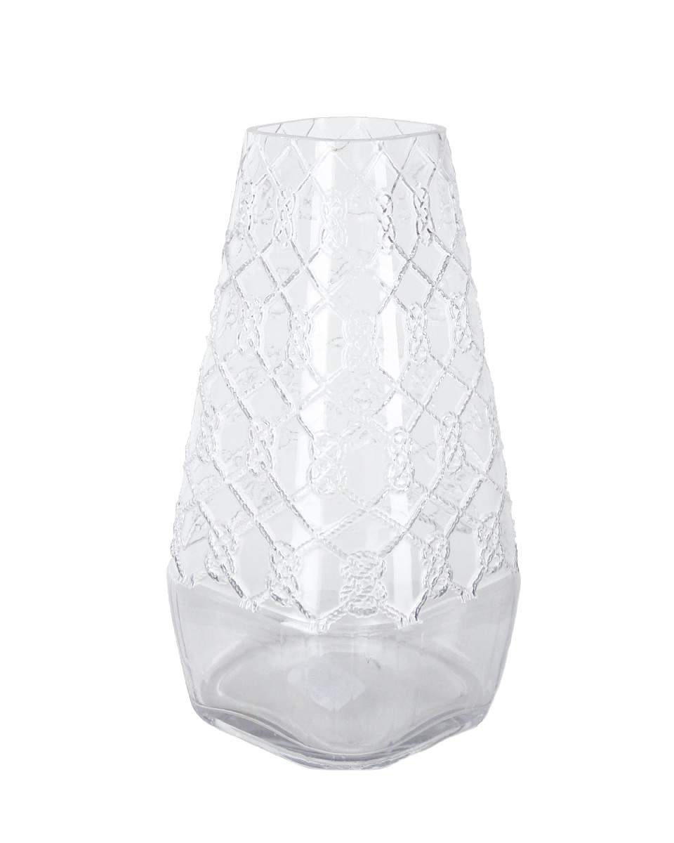Modern tapered vase with a delicate raised honeycomb pattern on the upper half and smooth clear glass below. Elegant and contemporary, ideal for showcasing lush blooms or minimalist stems.