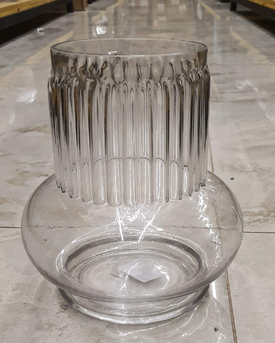 Unique modern vase with a spherical base and tall, vertical-ribbed cylindrical neck. Striking silhouette perfect for bold single stems or contemporary decorative displays.