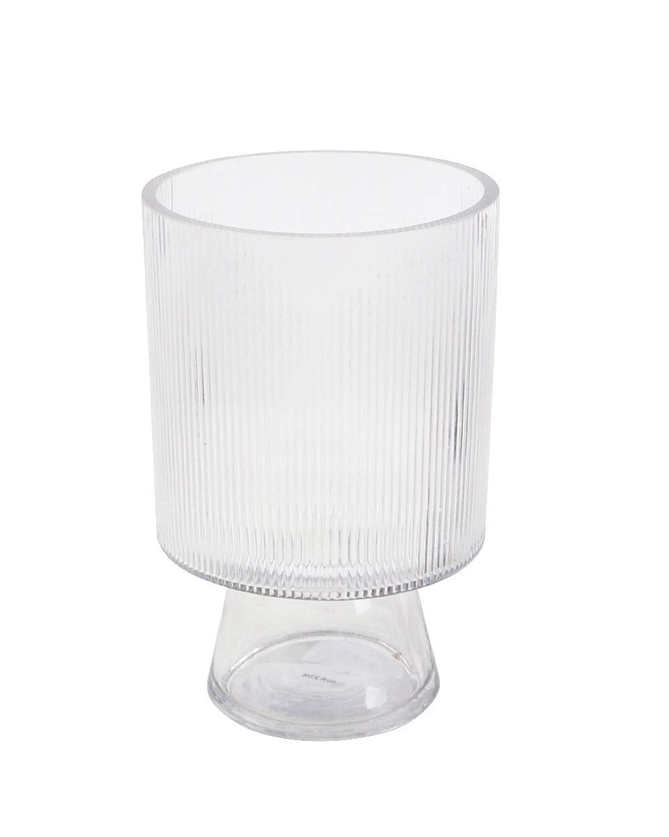 Modern cylindrical vase with fine vertical ribbing and an elevated conical pedestal base. Clean, architectural design that adds height and elegance to any floral arrangement.