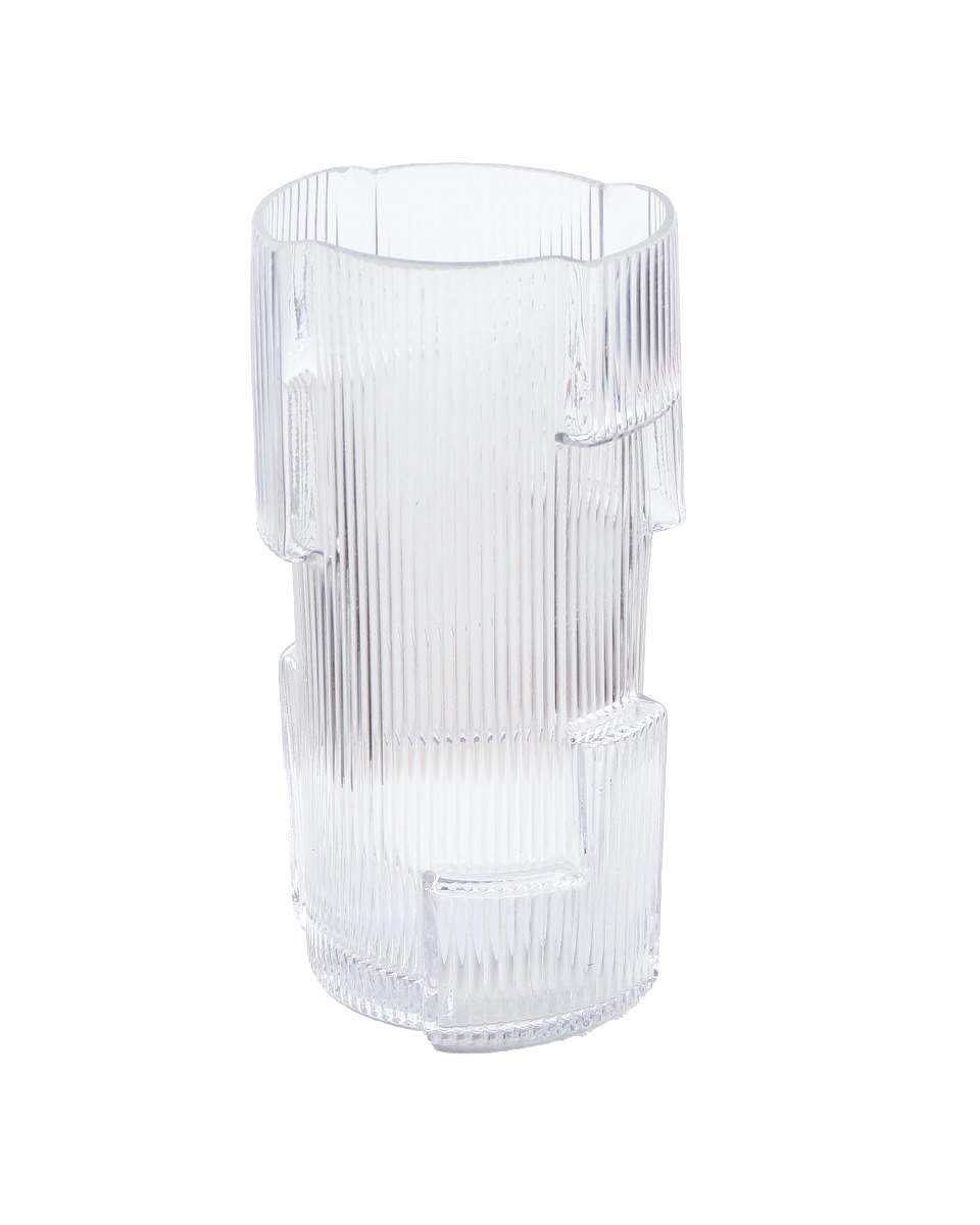 Bold, sculptural clear glass vase with staggered, offset ribbed cylinders creating a modern architectural silhouette. A striking contemporary piece for minimalist or avant-garde floral displays.