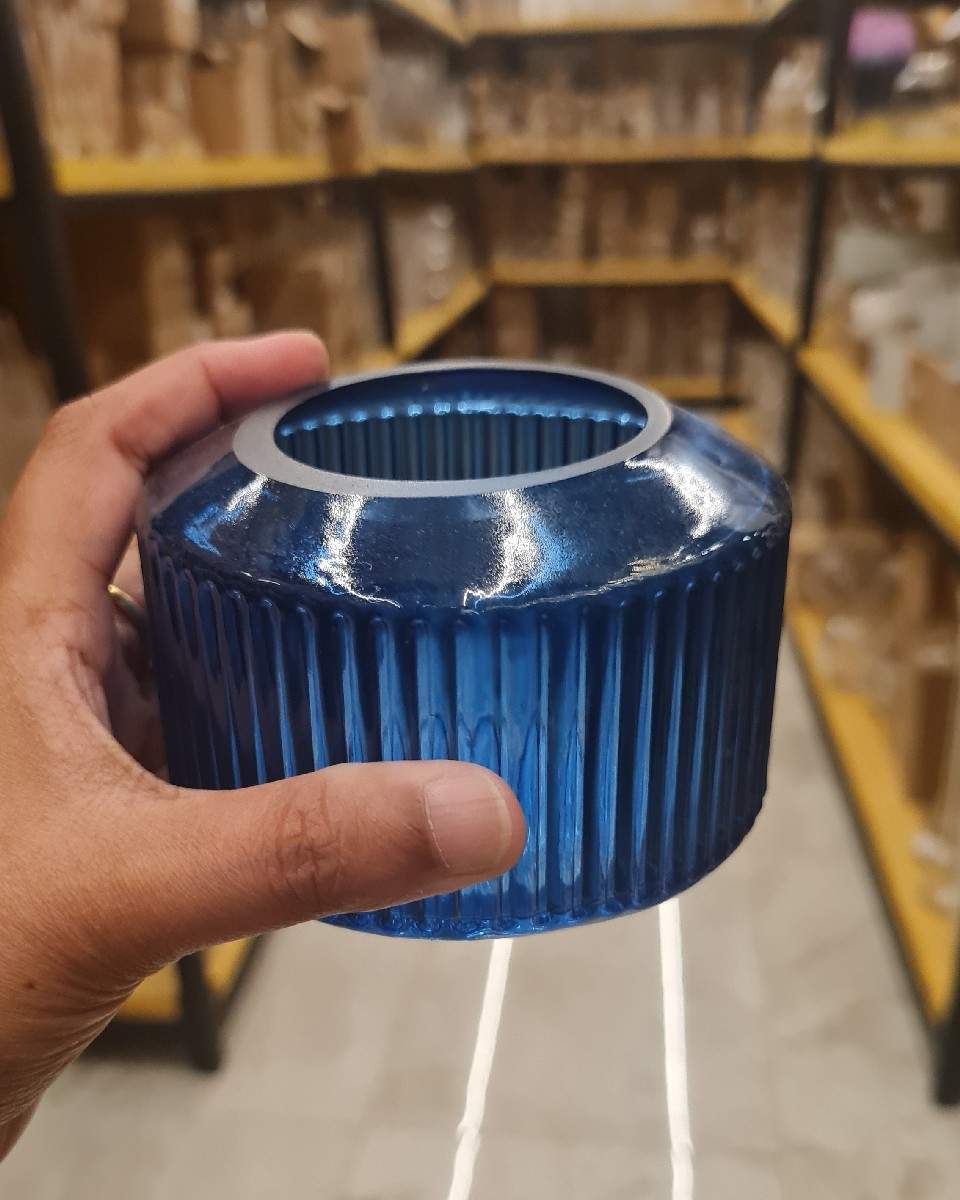 Compact, vibrant cobalt blue glass vase with bold vertical ribbing and a wide, stable rim. A striking pop of color for small buds, succulents, or modern tabletop accents.