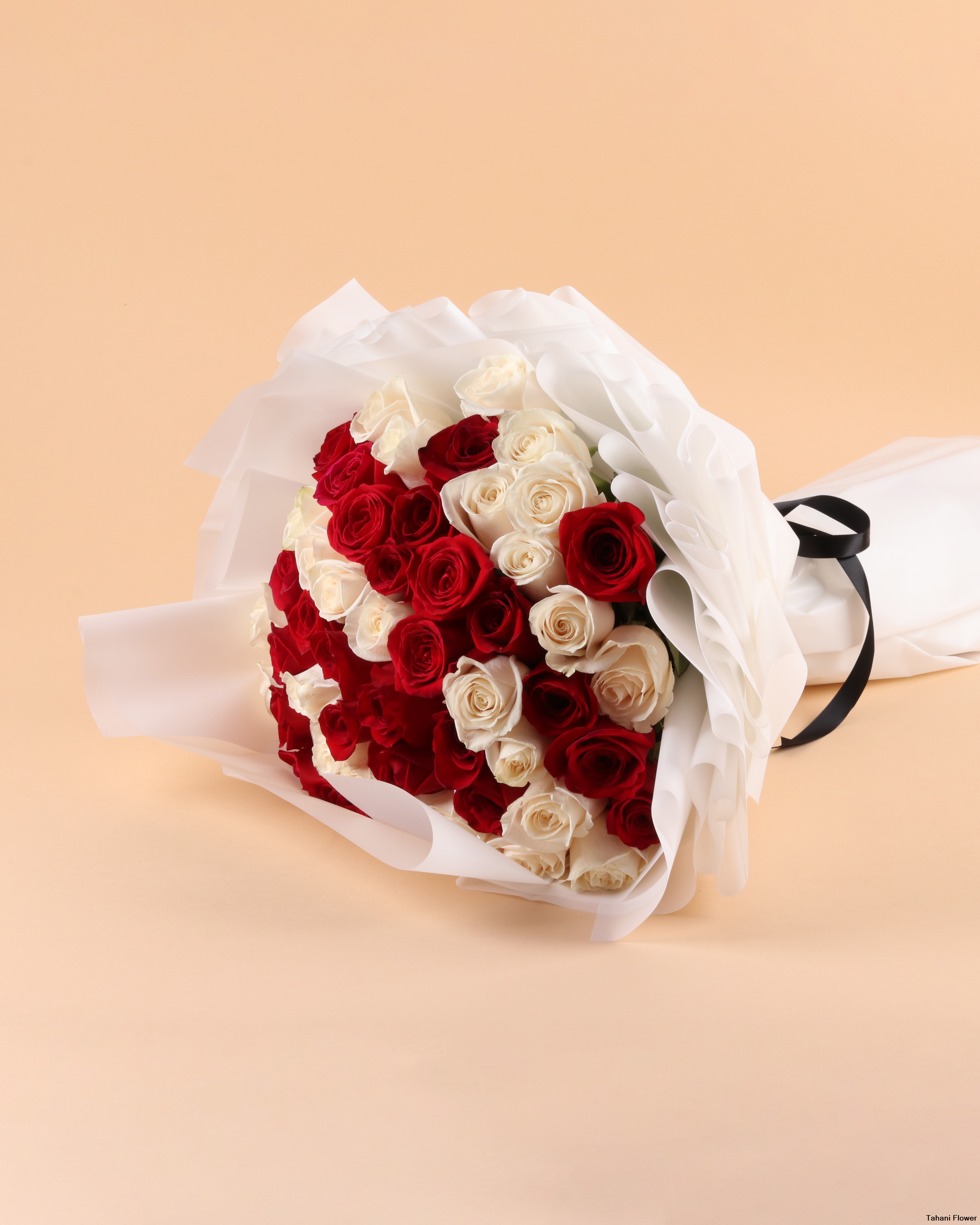 25pc Red Roses, 25pcs white Roses and white wrapper.