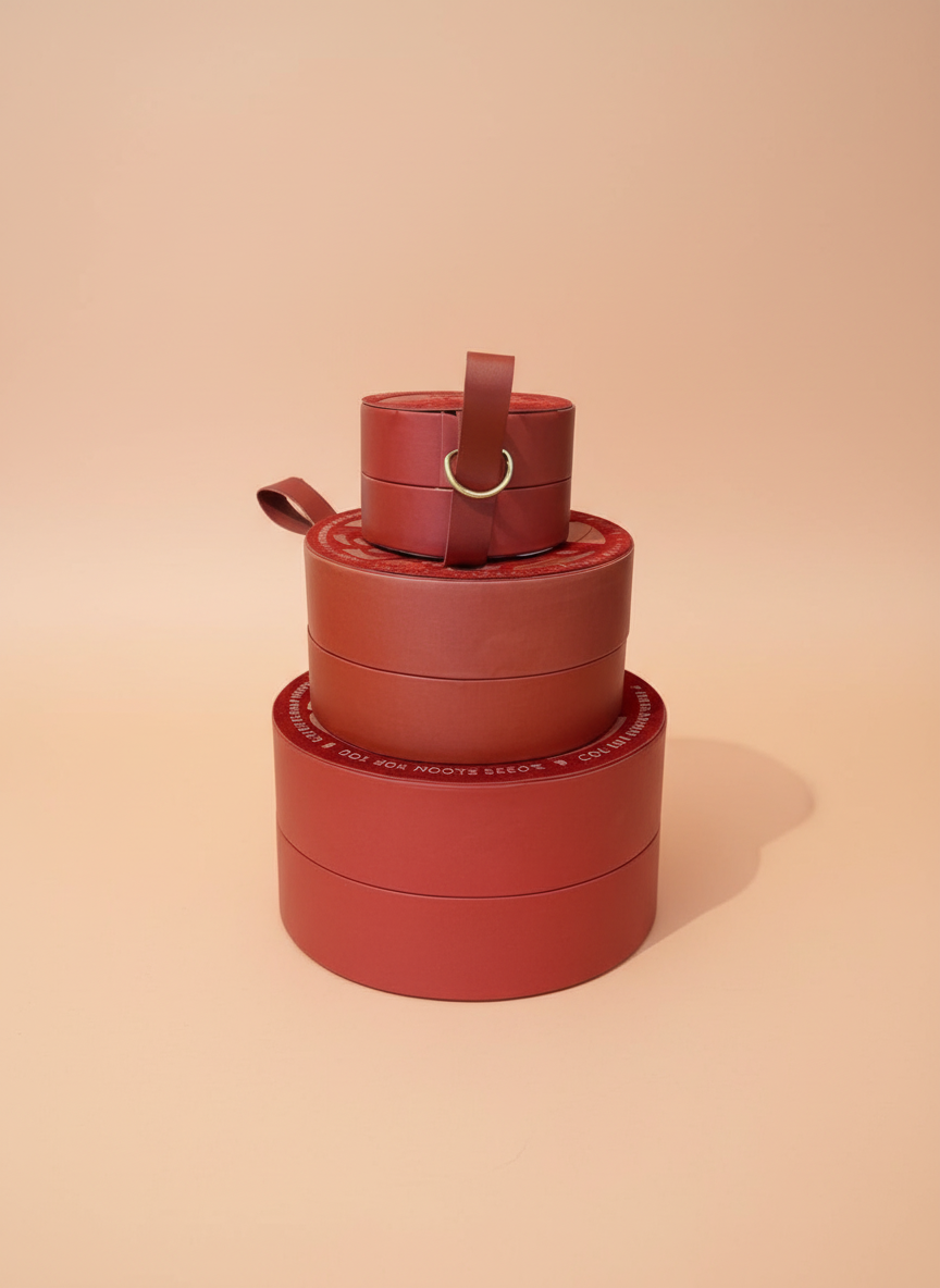 Sophisticated 3-tier stackable gift box set in rich matte red with a luxurious leather-like finish and gold-tone ring accent. Features elegant embossed motivational messages and a sturdy matching carry handle. Ideal for high-end hampers, anniversaries, Valentine’s, or luxury corporate gifting with a bold, timeless appeal.