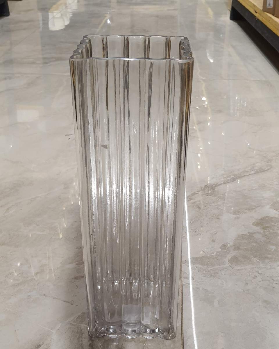Tall rectangular vase in smoky gray glass with elegant vertical ribbing and softly scalloped top and bottom edges. A refined, modern piece for sleek floral arrangements or minimalist decor.