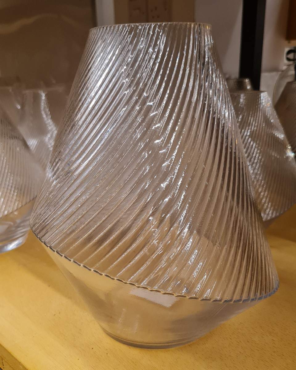 Elegant asymmetrical vase in smoky gray glass with dynamic diagonal ribbing and a sculptural, slanted silhouette. A modern, artistic statement piece for contemporary floral arrangements.