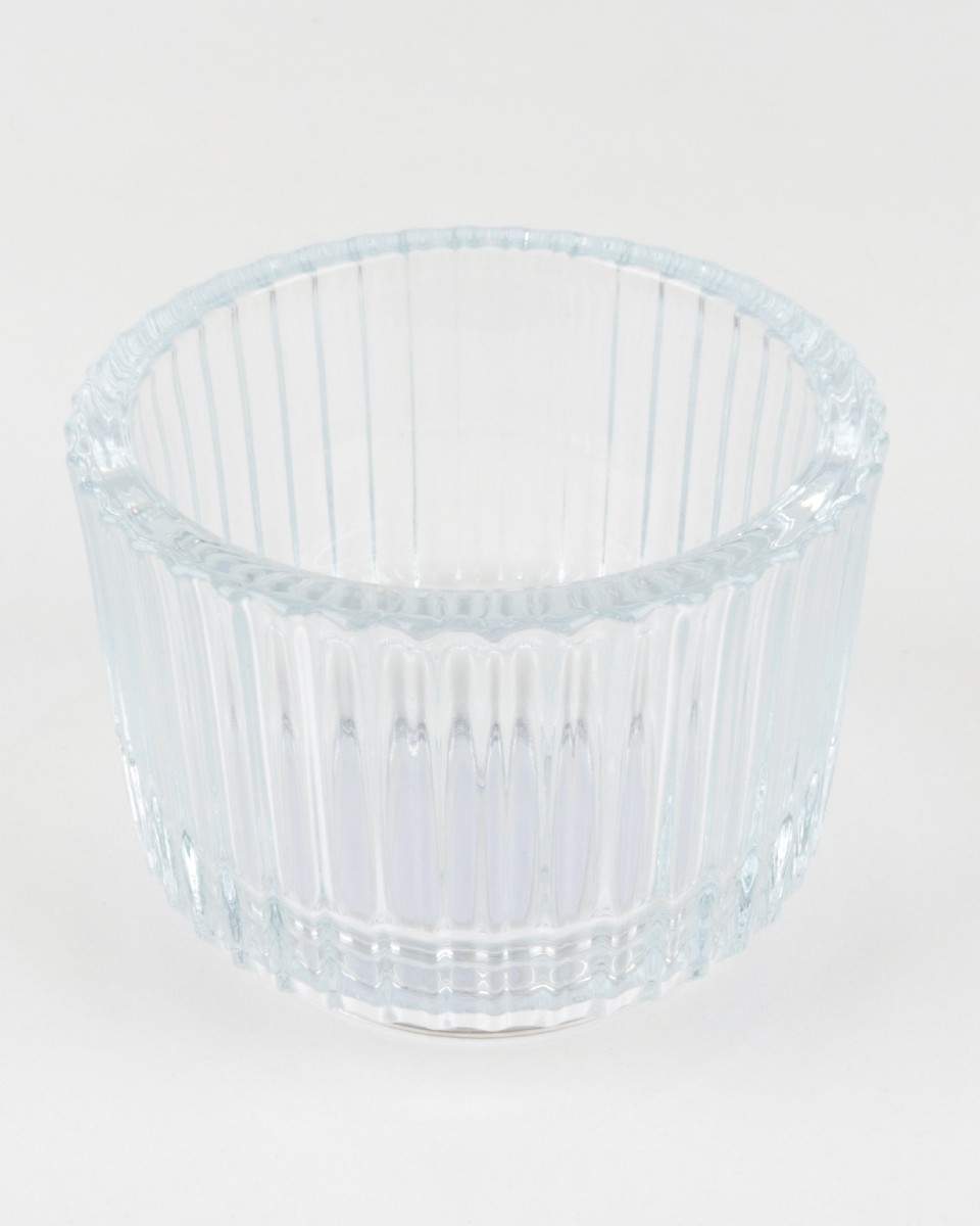 Clear, low-profile glass bowl with bold vertical ribbing. Ideal for floating candles, petals, or lush low centerpieces with a touch of vintage charm.