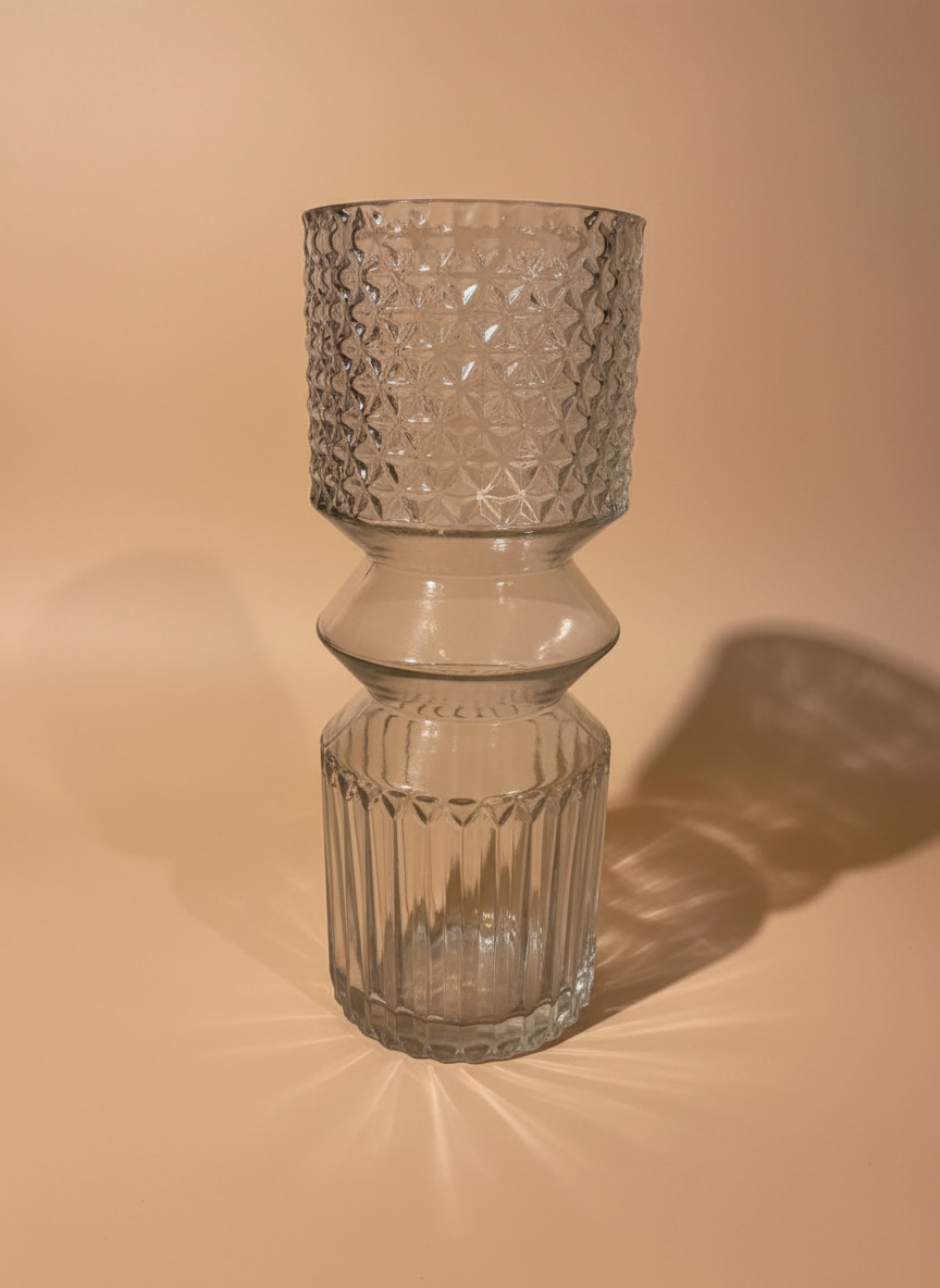 A striking clear glass vase with a bold hourglass silhouette, featuring intricate diamond-cut texture on top and vertical fluting below for a modern, sculptural statement.