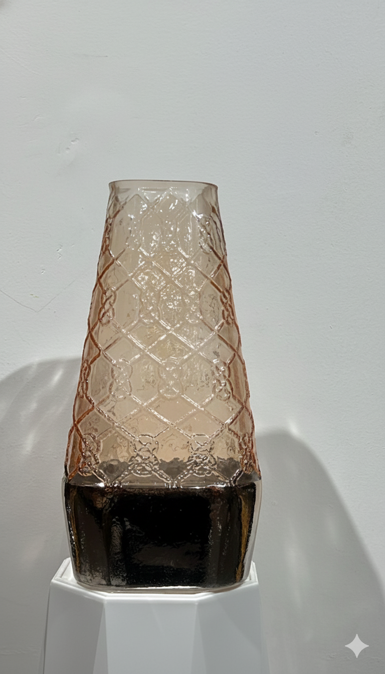 Tall amber glass vase with intricate raised diamond pattern and glossy dark bronze base.