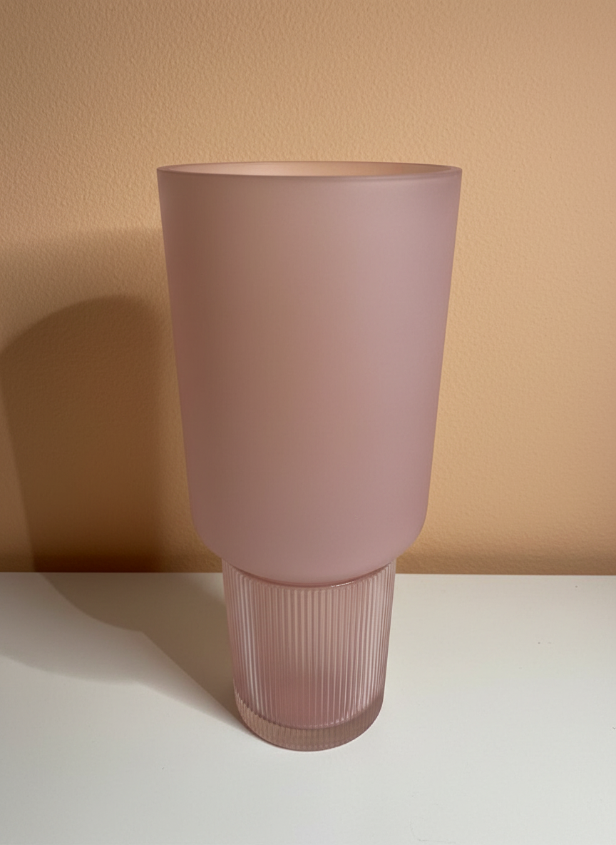 A soft matte blush-pink glass vase with a smooth frosted upper body and textured vertical ribbing at the base, blending Scandinavian minimalism with gentle warmth.