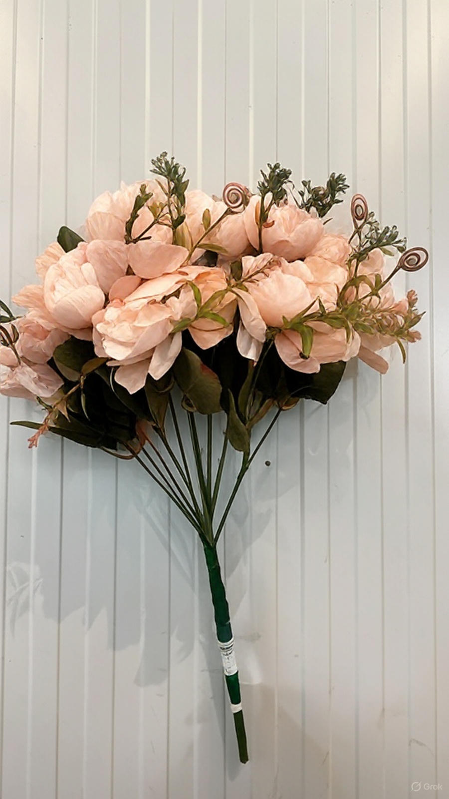 Lush artificial peony bush in soft blush pink with green leaves and delicate curled accents, perfect for home décor, weddings, or events. Realistic silk blooms tied with green floral tape.