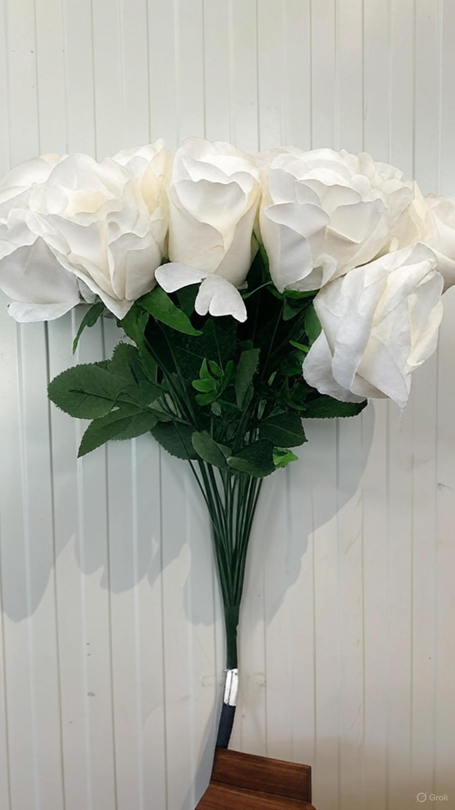 Elegant artificial bouquet of pristine white roses with fresh green leaves. Timeless and versatile for weddings, anniversaries, or sophisticated home decor.