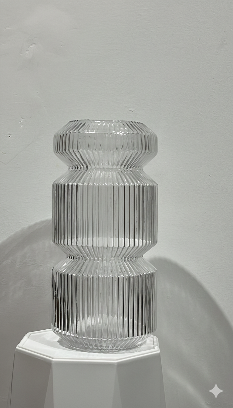Modern clear glass vase with sharp vertical ribbing and bold stacked angular tiers.