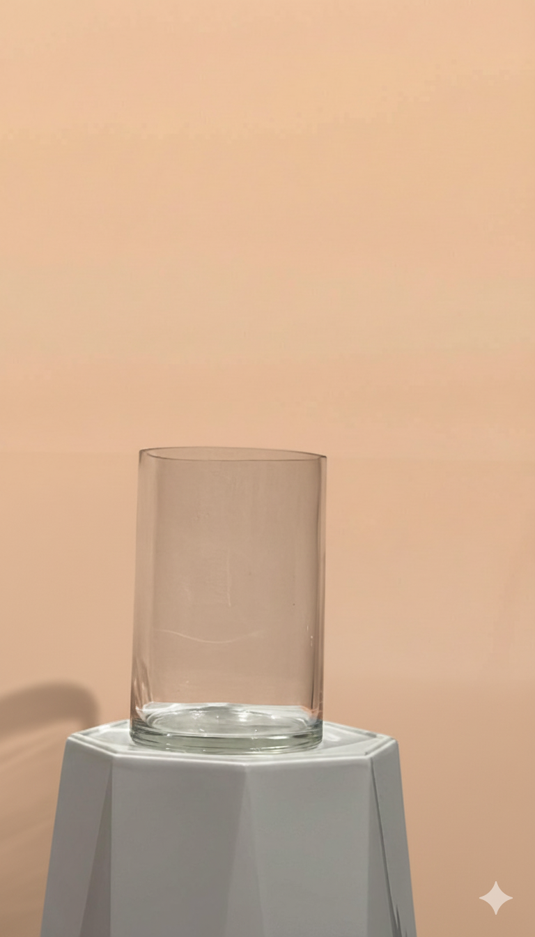A minimalist, transparent glass tumbler with a sleek cylindrical design, perfect for everyday use or elegant table settings.