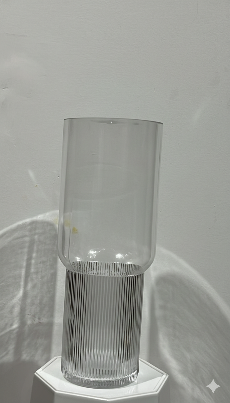 Tall, sleek clear glass vase with a smooth upper body and textured vertical ribbing on the lower half. Modern and versatile — ideal for long stems, lush arrangements, or minimalist décor.