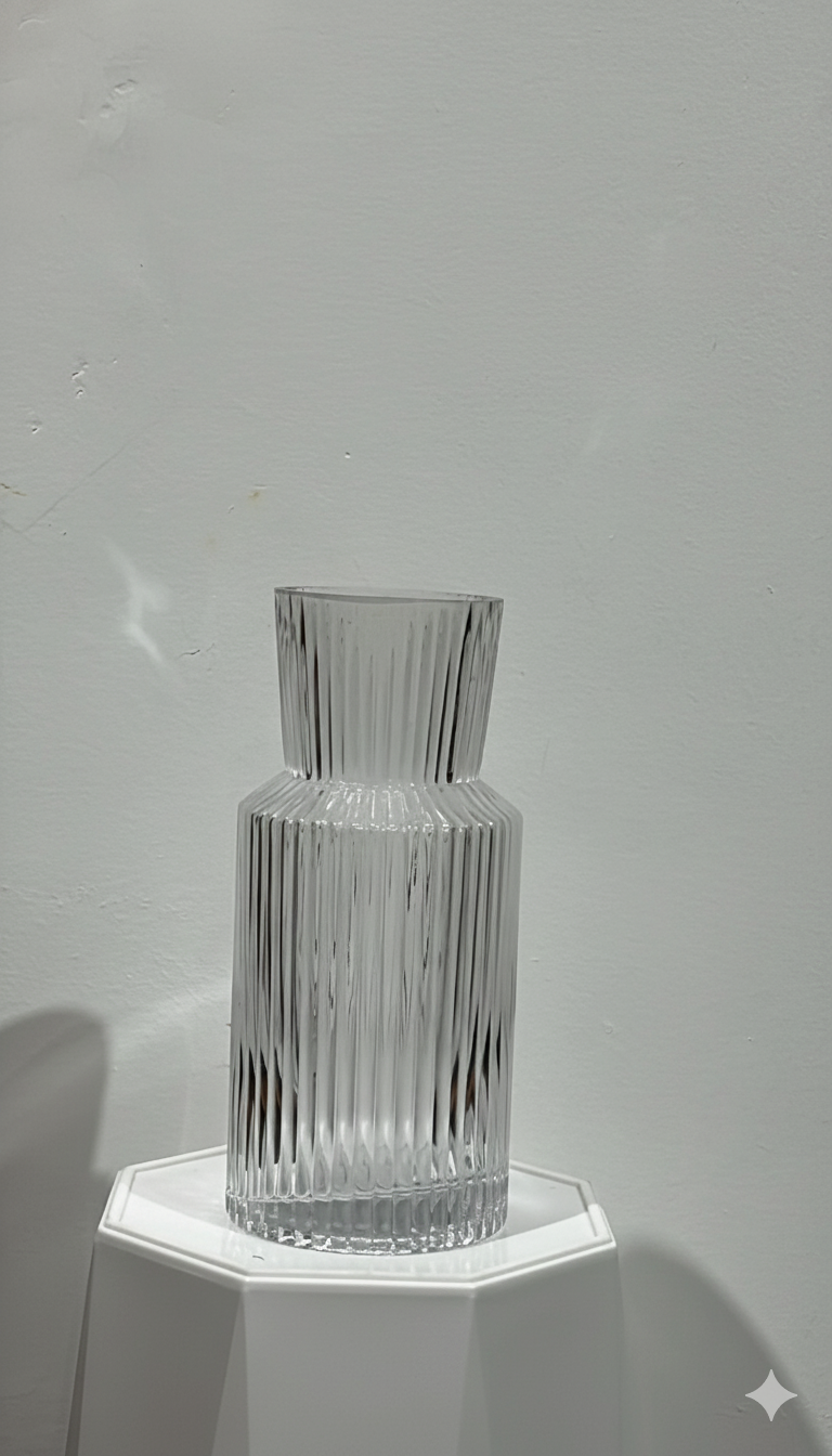 Sleek, modern clear glass vase with vertical ribbed texture and a cinched geometric design. Perfect for showcasing floral arrangements or as a minimalist standalone statement piece.