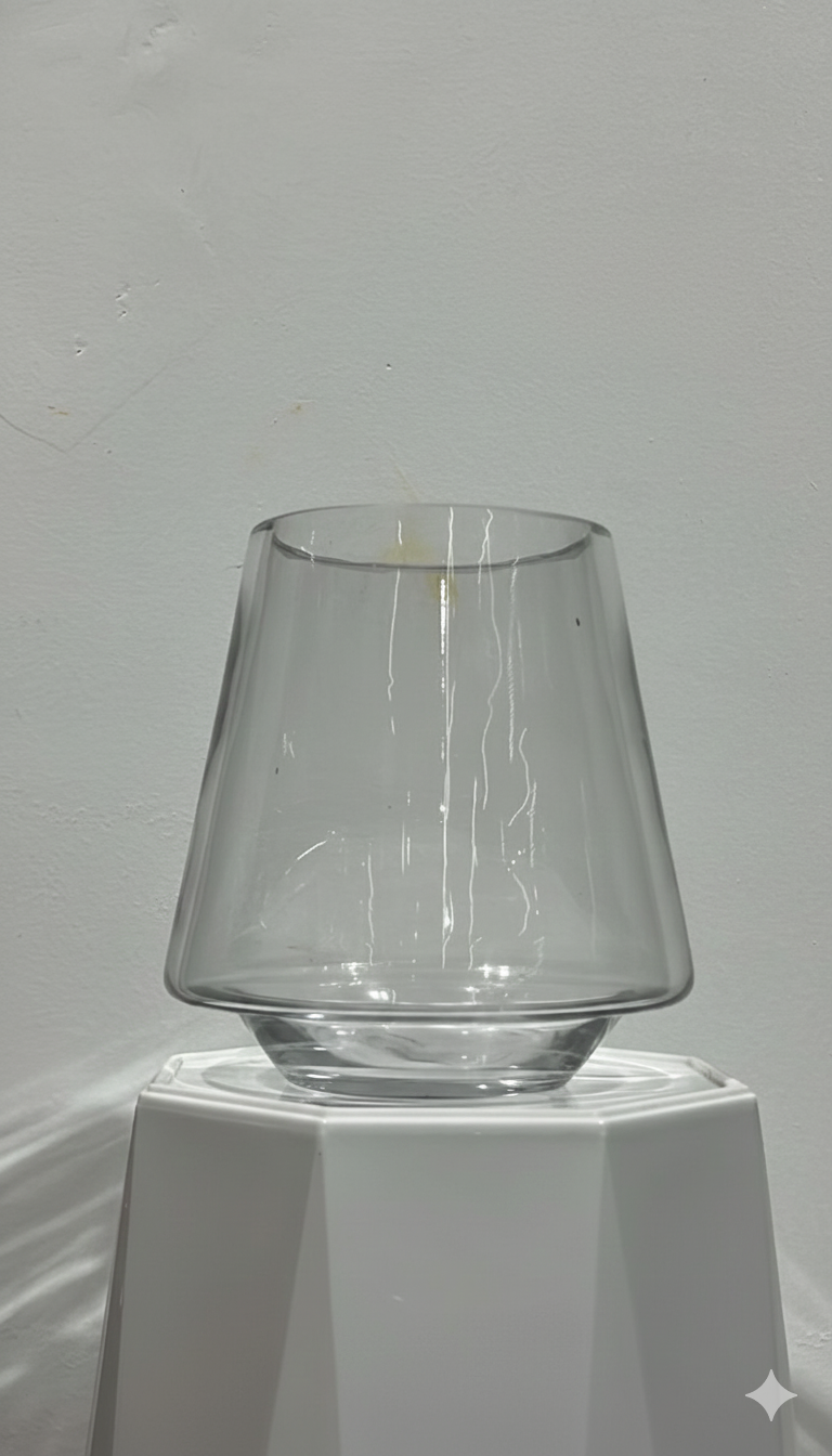 Simple, modern clear glass vase with a wide mouth and gently tapered body. Versatile and elegant, perfect for short bouquets, floating candles, or minimalist floral displays.