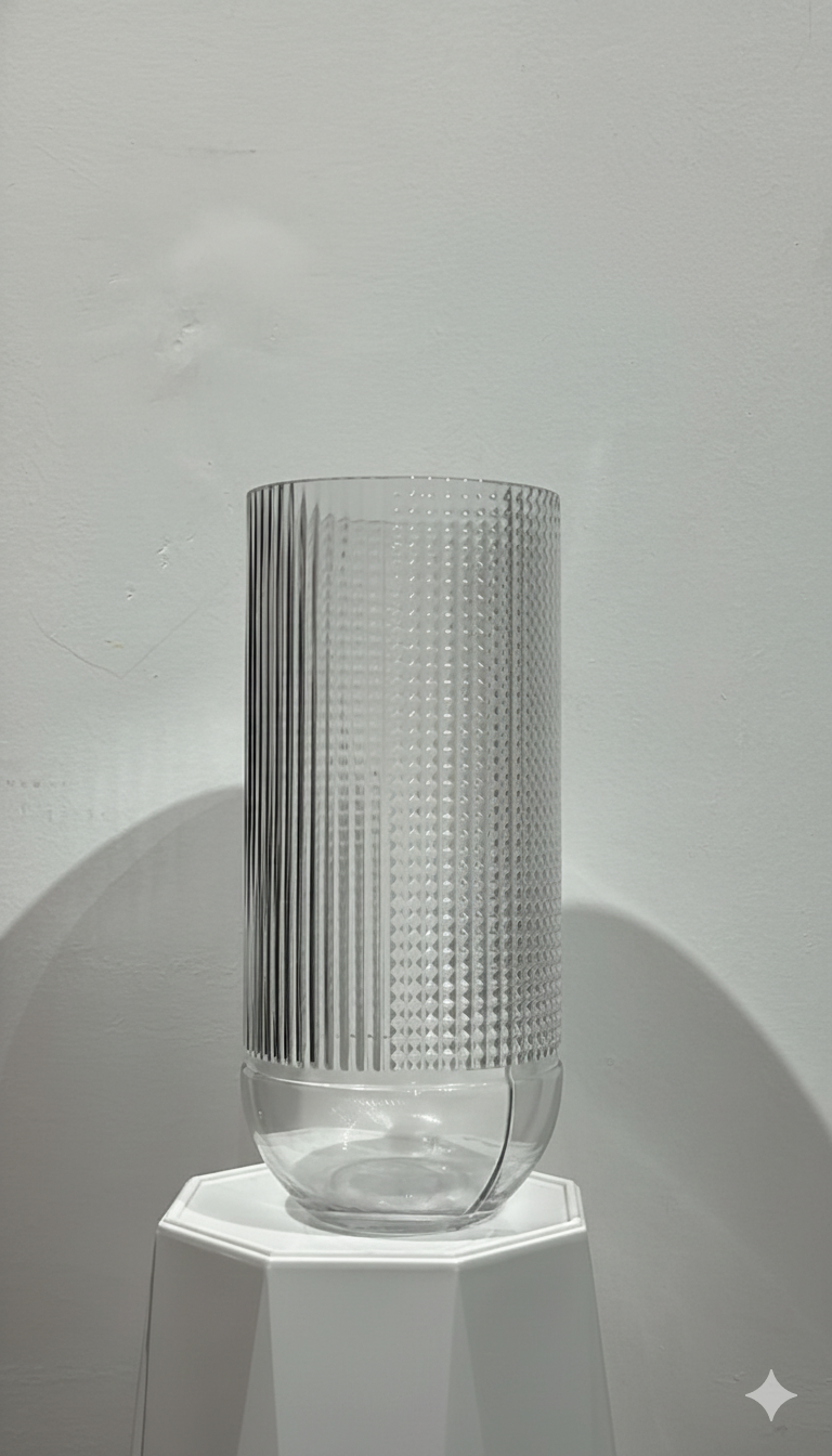 Chic clear glass vase with bold vertical stripes and intricate diamond texture. Sleek, modern look with a smooth rounded base.