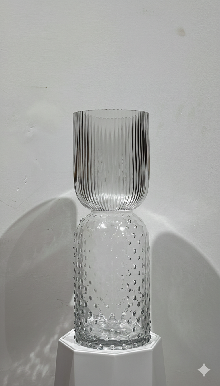 Clear glass vase with ribbed upper section and raised dot texture below.