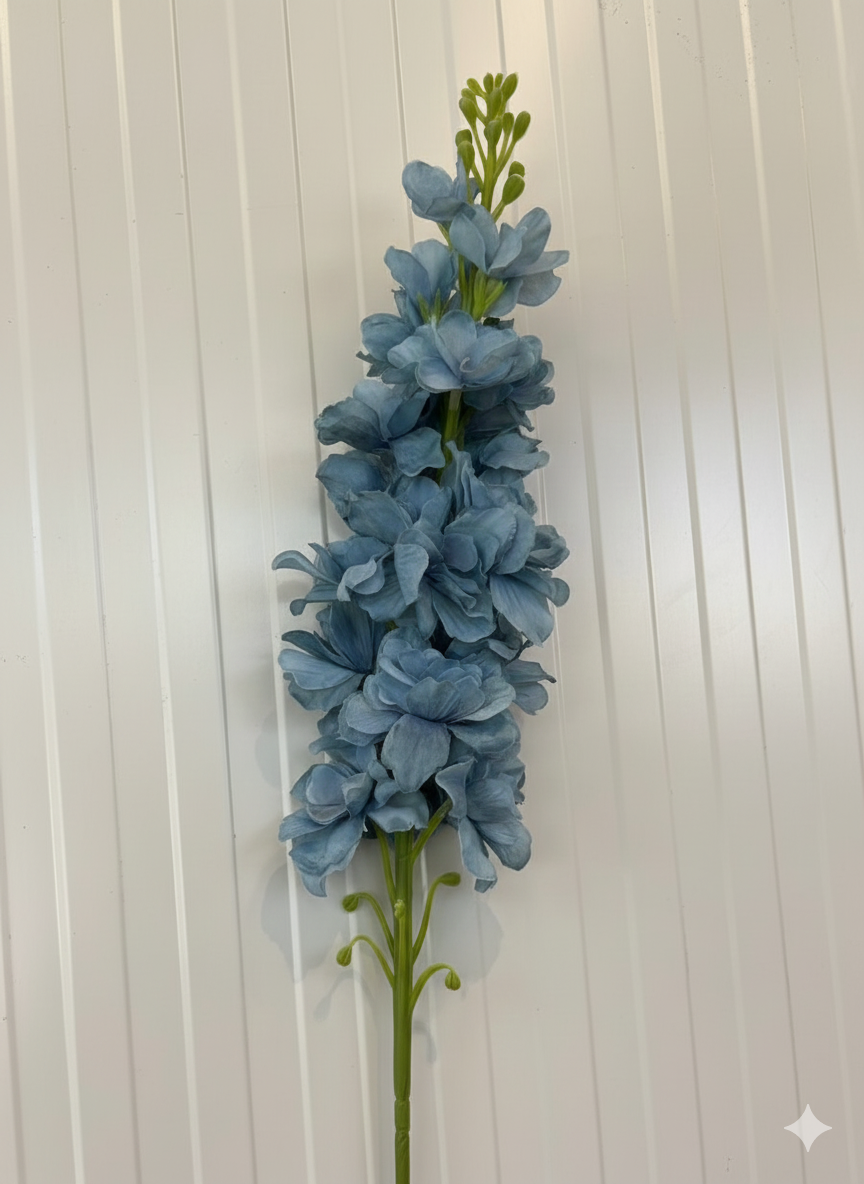 Tall artificial delphinium spray featuring soft dusty blue blooms and natural green foliage. Perfect for adding serene height and vintage charm to wedding arrangements, large vases, or coastal-inspired décor.