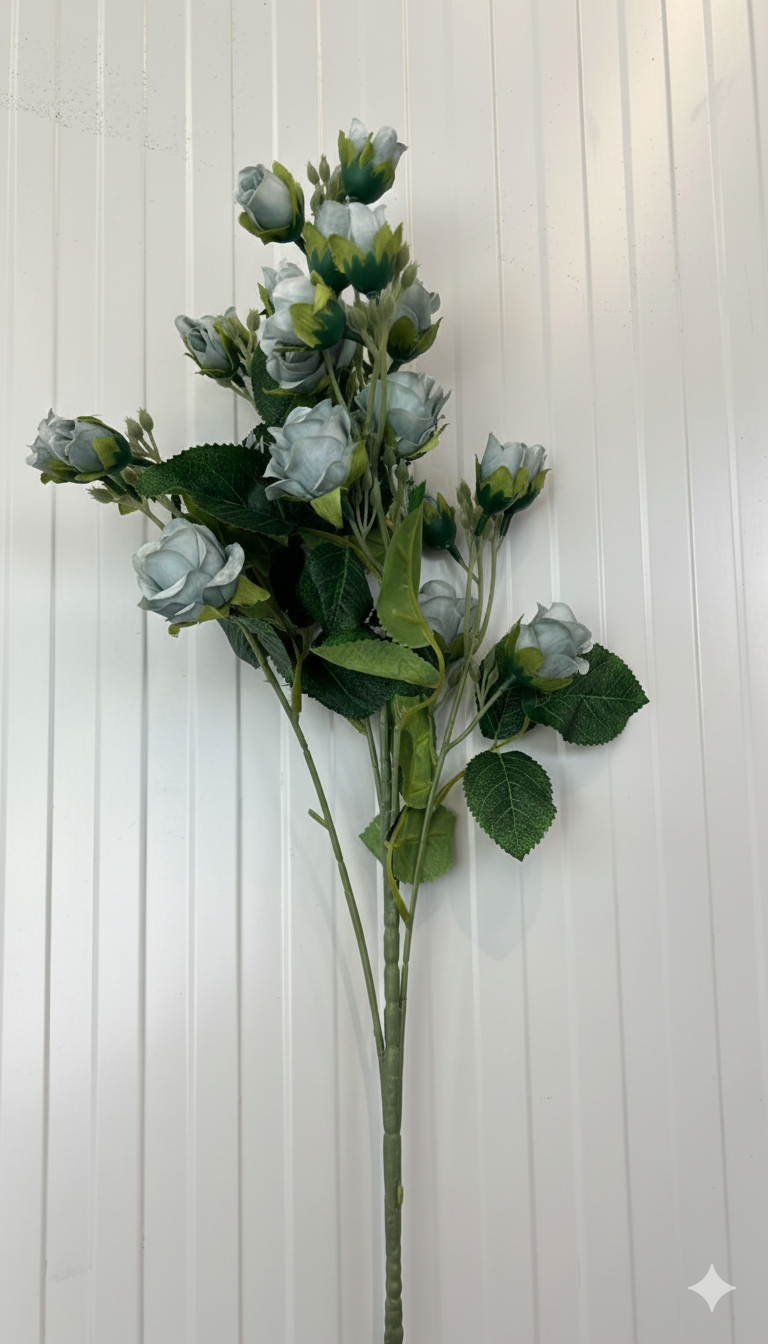 Soft, romantic artificial mini rose bush with muted dusty blue blooms, tight buds, and natural green foliage. Ideal for rustic weddings, shabby chic décor, or adding a cool-toned vintage charm to arrangements.