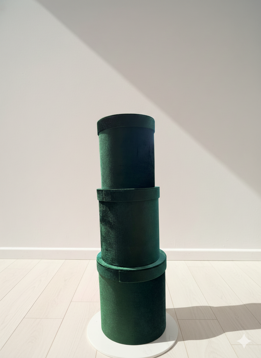 Set of three luxurious emerald green velvet round hatboxes in graduated sizes. Rich, elegant packaging ideal for premium roses or special gifts.