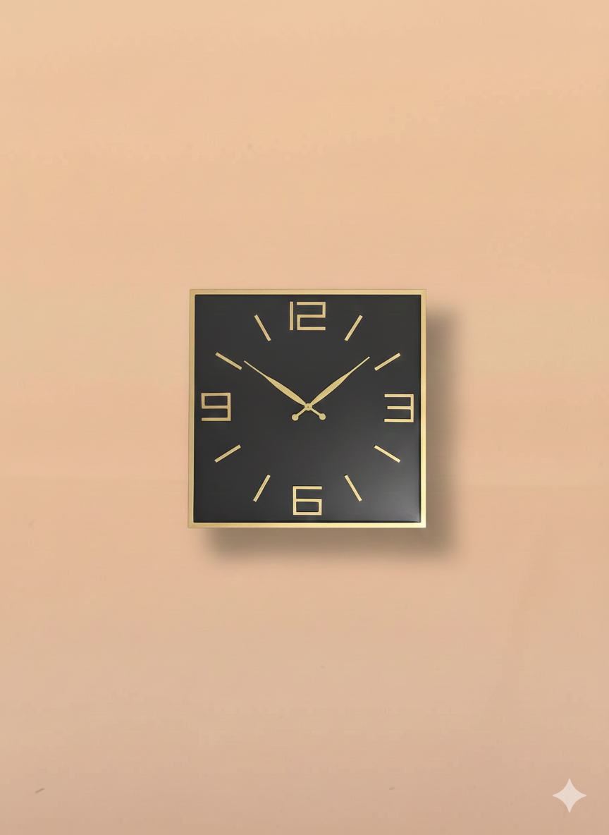 Sleek mid-century style square wall clock with matte black face, bold gold numerals, and slim gold frame. Perfect for modern, minimalist, or retro-inspired interiors.