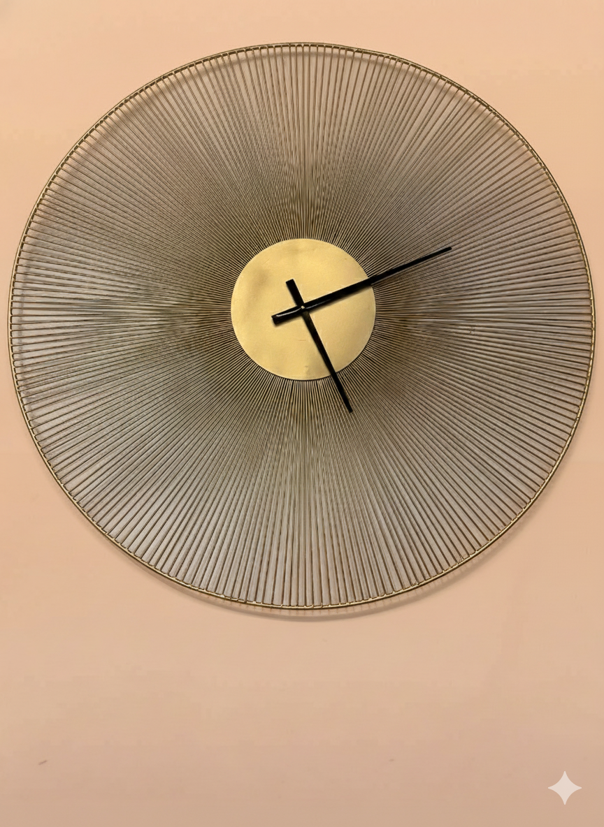 Striking oversized wall clock with delicate gold metal wire rays radiating from a central gold disc and minimalist black hands – a bold, artistic statement piece for modern and luxury interiors.