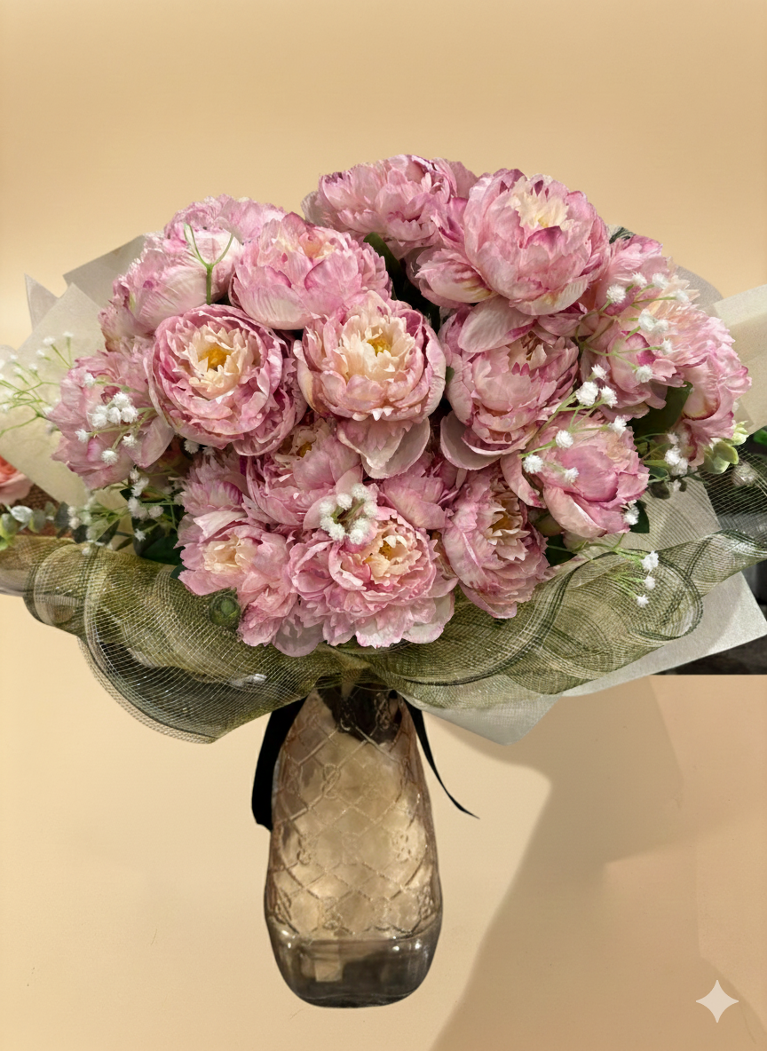 Opulent hand-tied bouquet of soft blush-pink peonies with delicate baby’s breath accents, wrapped in premium mesh and presented in a textured gold glass vase. Pure romance and elegance.