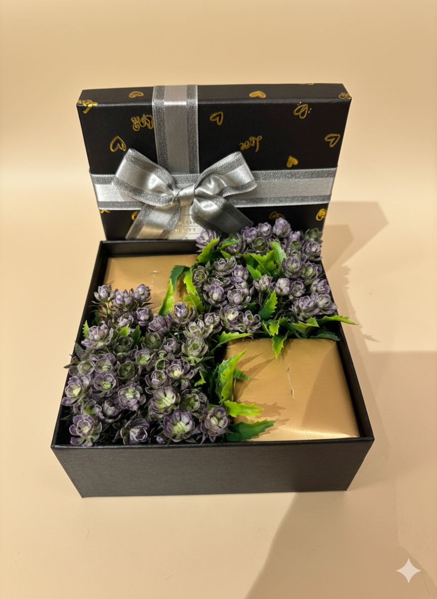 Elegant black gift box adorned with silver ribbon and gold hearts, revealing delicate purple succulents and premium wrapped chocolates. A sophisticated, ready-to-gift indulgence.