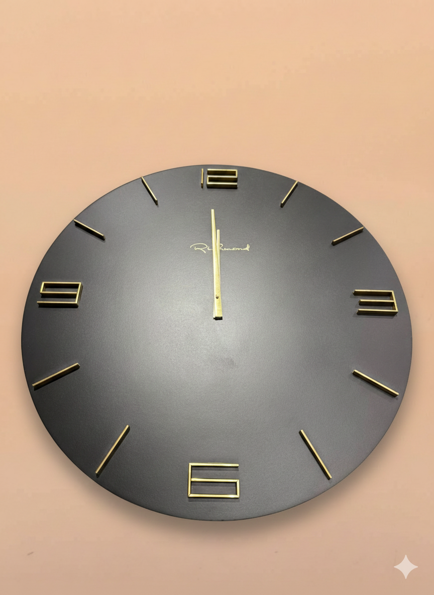 Sleek matte black wall clock with elegant gold Roman numerals at 12, 3, 6, and 9, signed "Ted Riser" in gold script. A timeless, modern statement piece for sophisticated interiors.