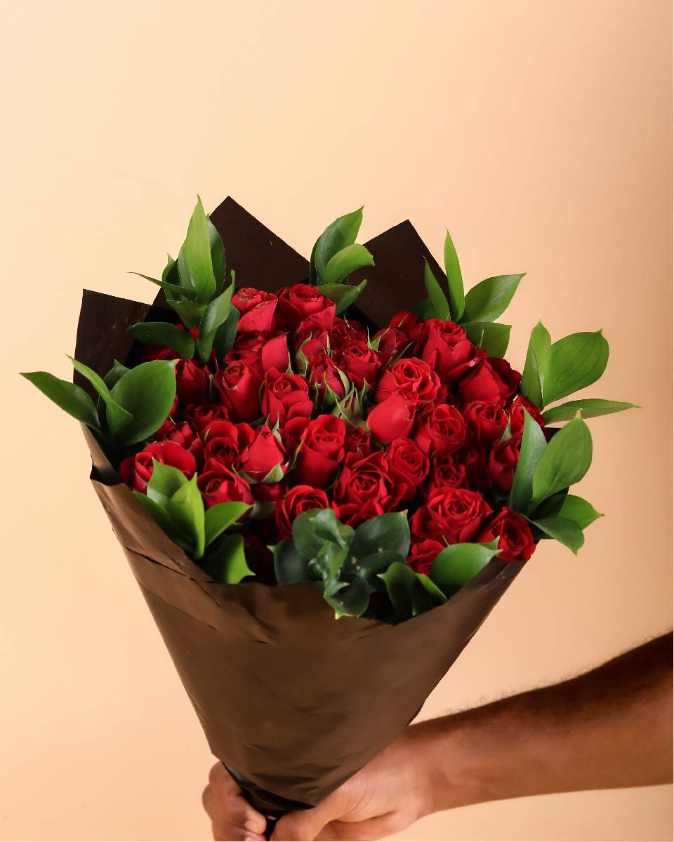 10stems baby rose Red, 1bunch Ruscus and Black Wrapper.