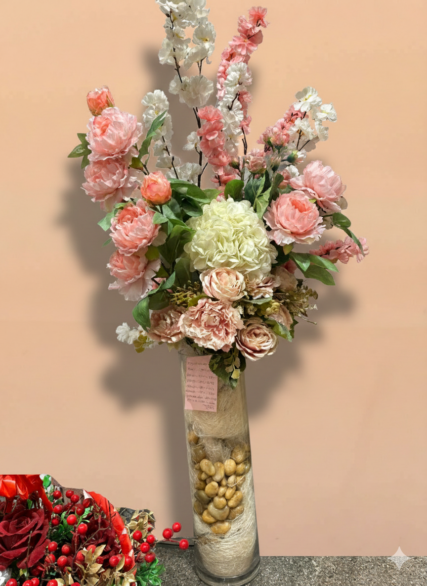 A luxurious tall arrangement of soft pink peonies, roses, hydrangeas, and delicate cherry blossoms in a clear glass vase filled with natural nuts and fibers. Perfect for adding a romantic, sophisticated touch to any space.