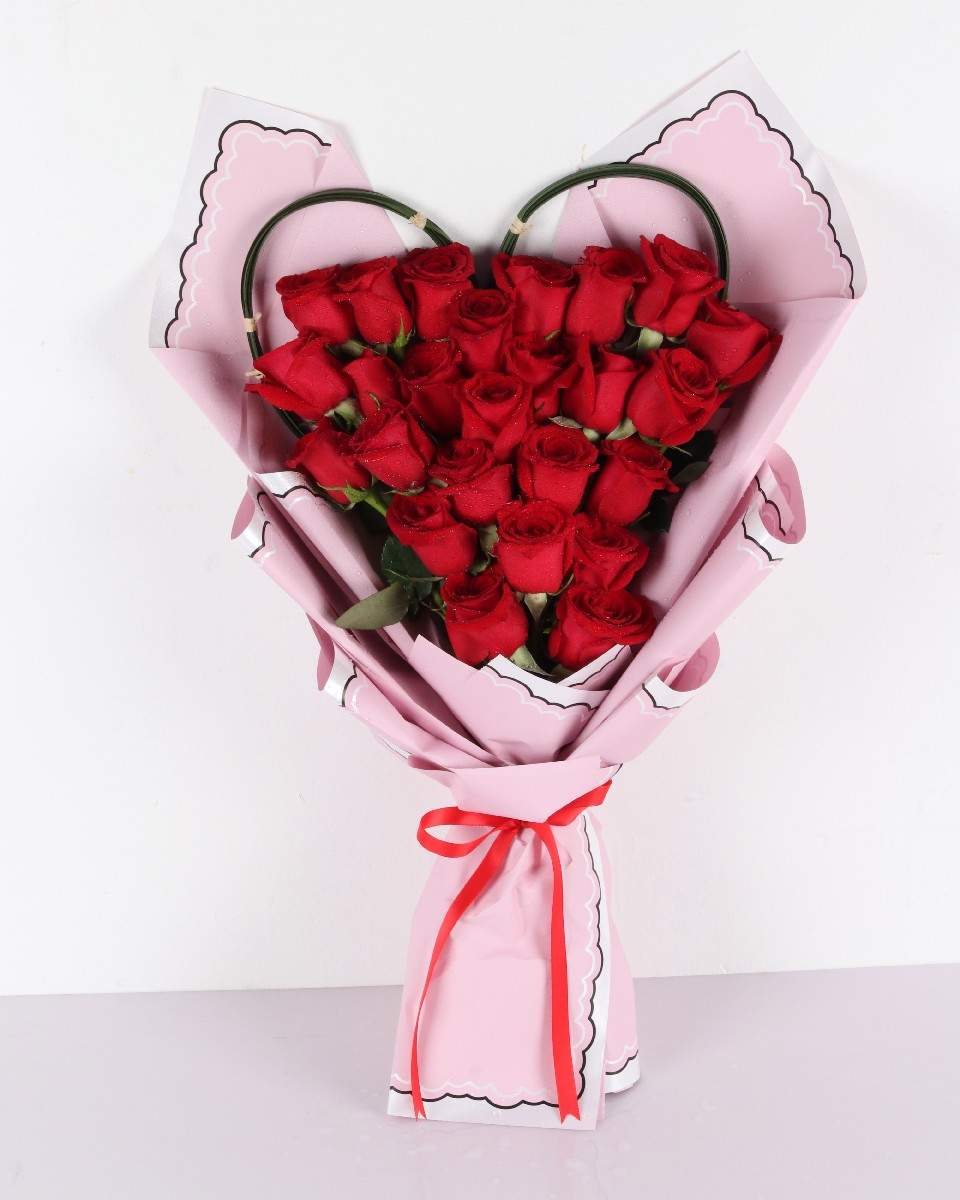 25pcs red rose, 1bunch steel grass and design pink wrapper.