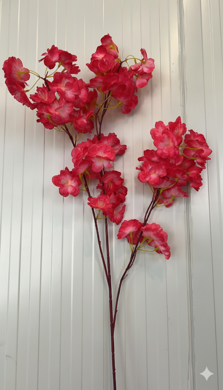 Vibrant artificial cherry blossom branch with rich red-pink blooms and natural brown stems. Perfect for adding bold color to arrangements, Valentine’s décor, or dramatic floral displays.