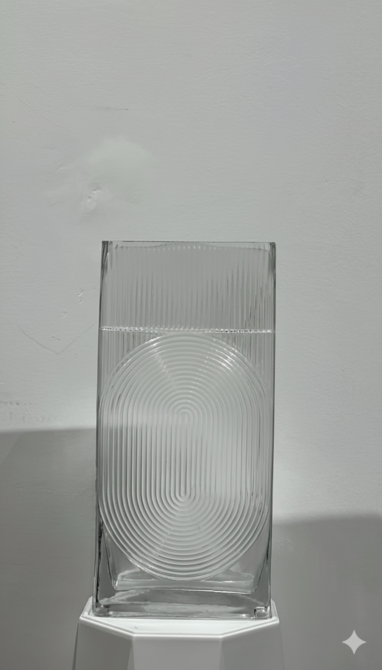 Tall clear glass vase with vertical ribbing on sides and a bold concentric oval ripple design on front.