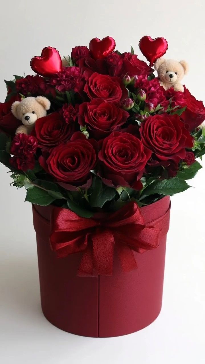 Luxurious burgundy hat box overflowing with deep red roses and carnations, accented with two cute teddy bears, red heart balloons, and a satin bow. The ultimate romantic gift for love and celebration.