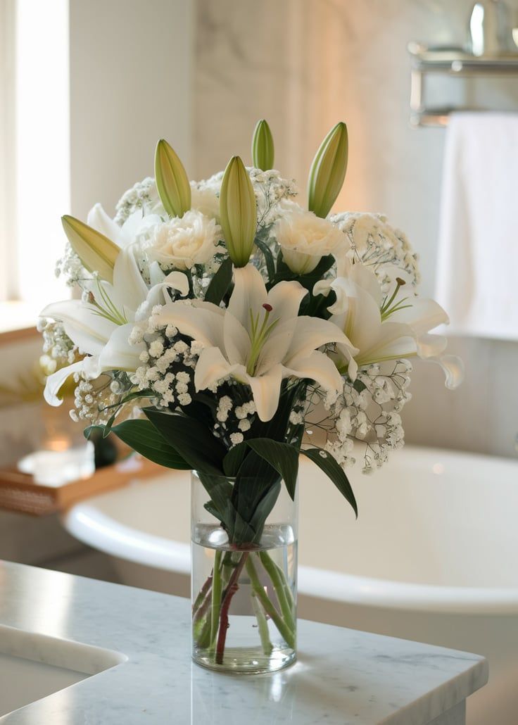 A luxurious, all-white arrangement of fragrant Oriental lilies, delicate carnations, and clouds of baby’s breath in a clear glass cylinder vase