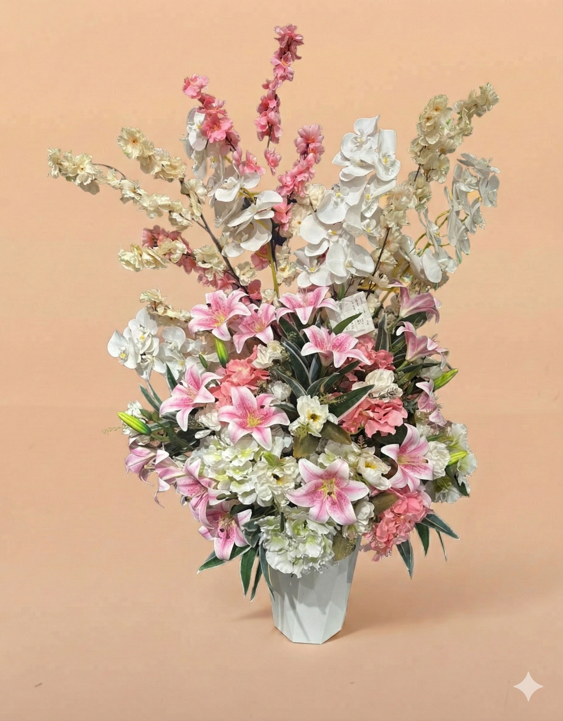 Tall, graceful arrangement of pink and white lilies, delicate cherry blossoms, and creamy blooms in a sleek white geometric vase. A romantic, airy statement piece perfect for any refined space.