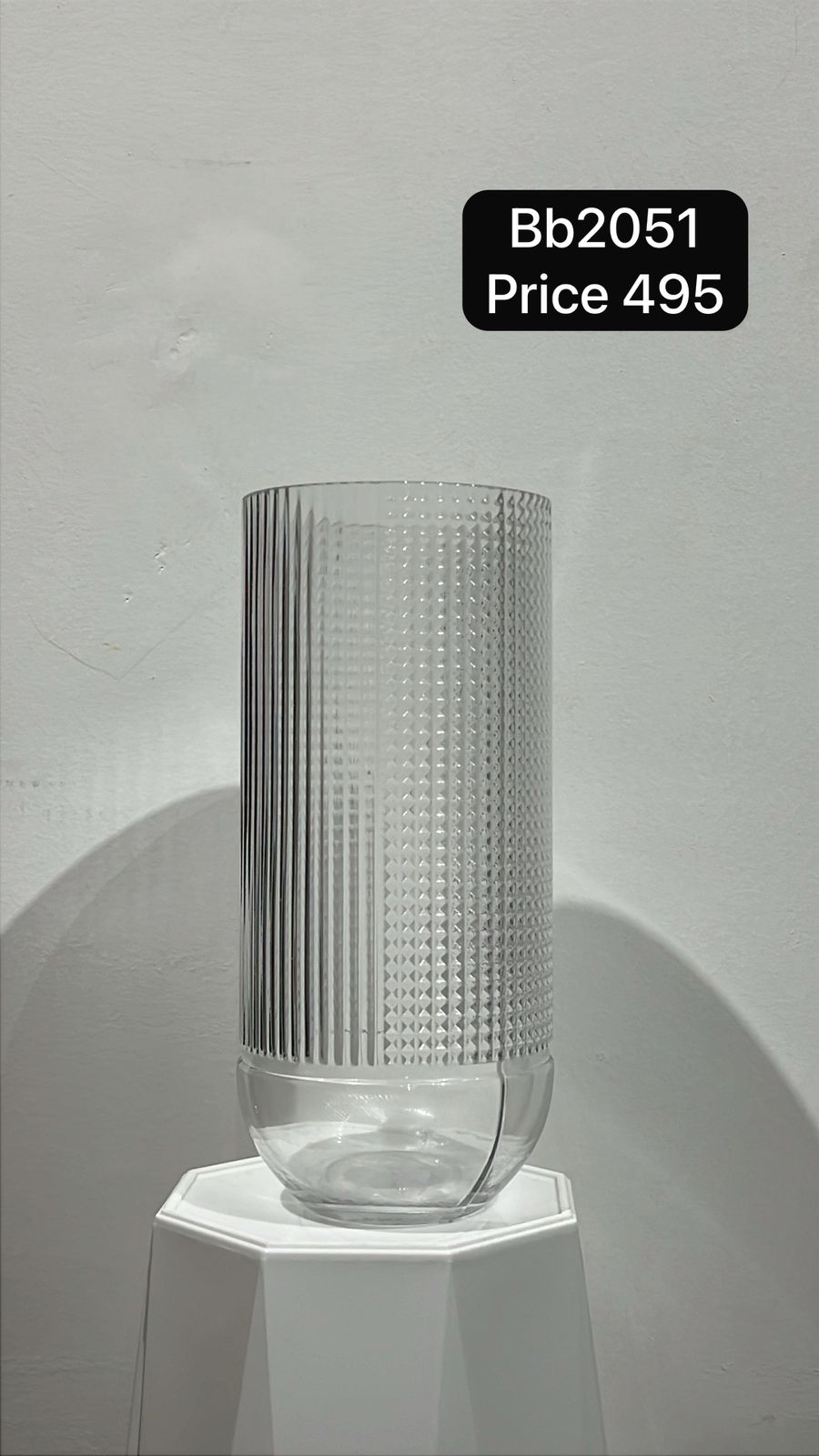 Elegant clear glass vase featuring mixed vertical stripes and diamond-cut texture. Sophisticated modern design with a rounded base.