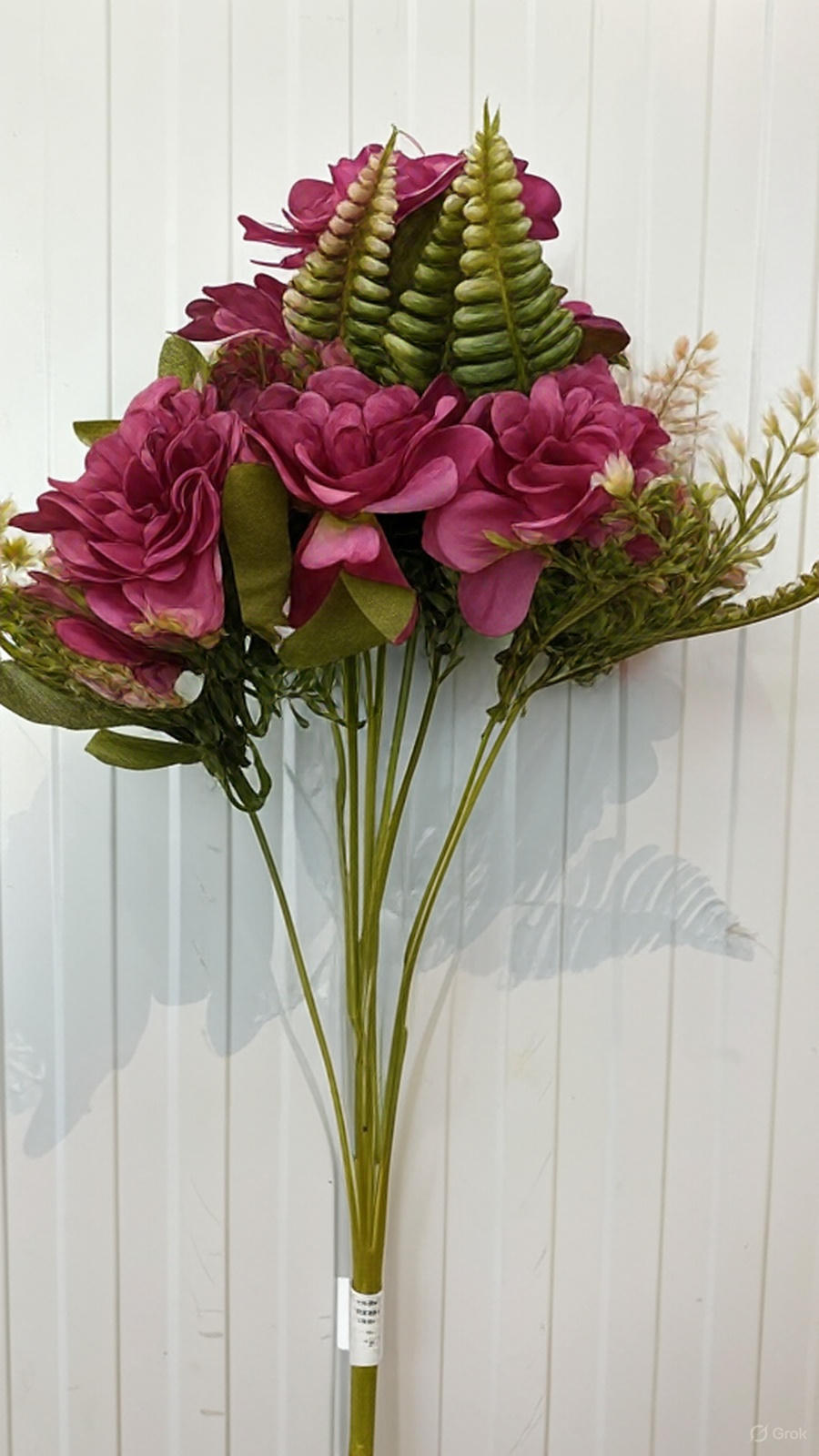 Bold artificial dahlias in rich magenta-pink with lush green foliage and textured fillers. Eye-catching and long-lasting, perfect for vibrant decor or special occasions.