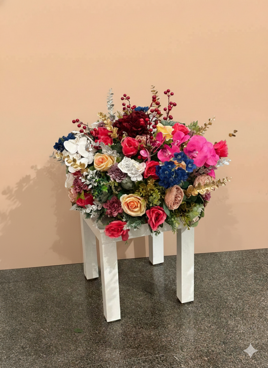 Lush, multicolored explosion of roses, orchids, hydrangeas, and berries in vivid pinks, reds, blues, oranges, and whites with golden accents. A joyful, statement-making centerpiece full of energy and charm.