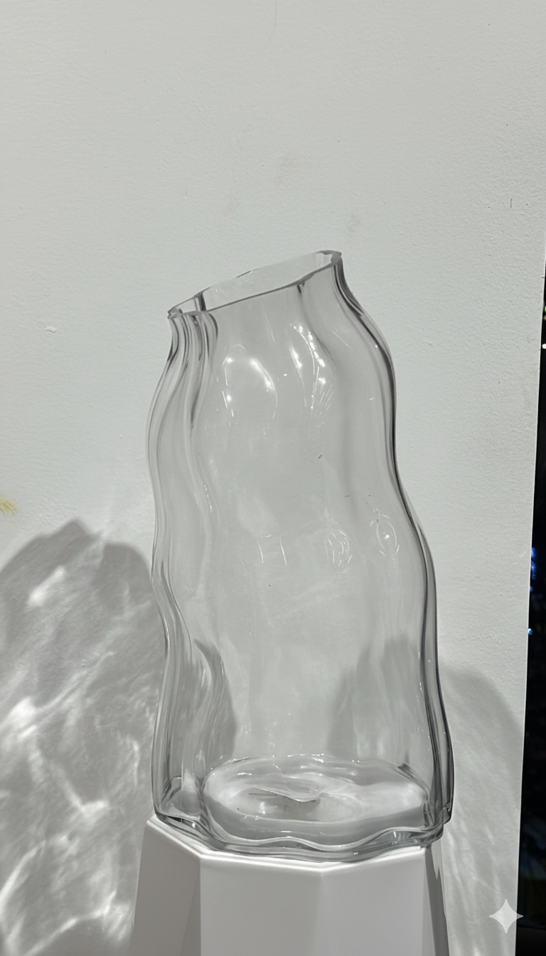 Clear glass vase with fluid, irregular wavy silhouette and softly undulating rim.