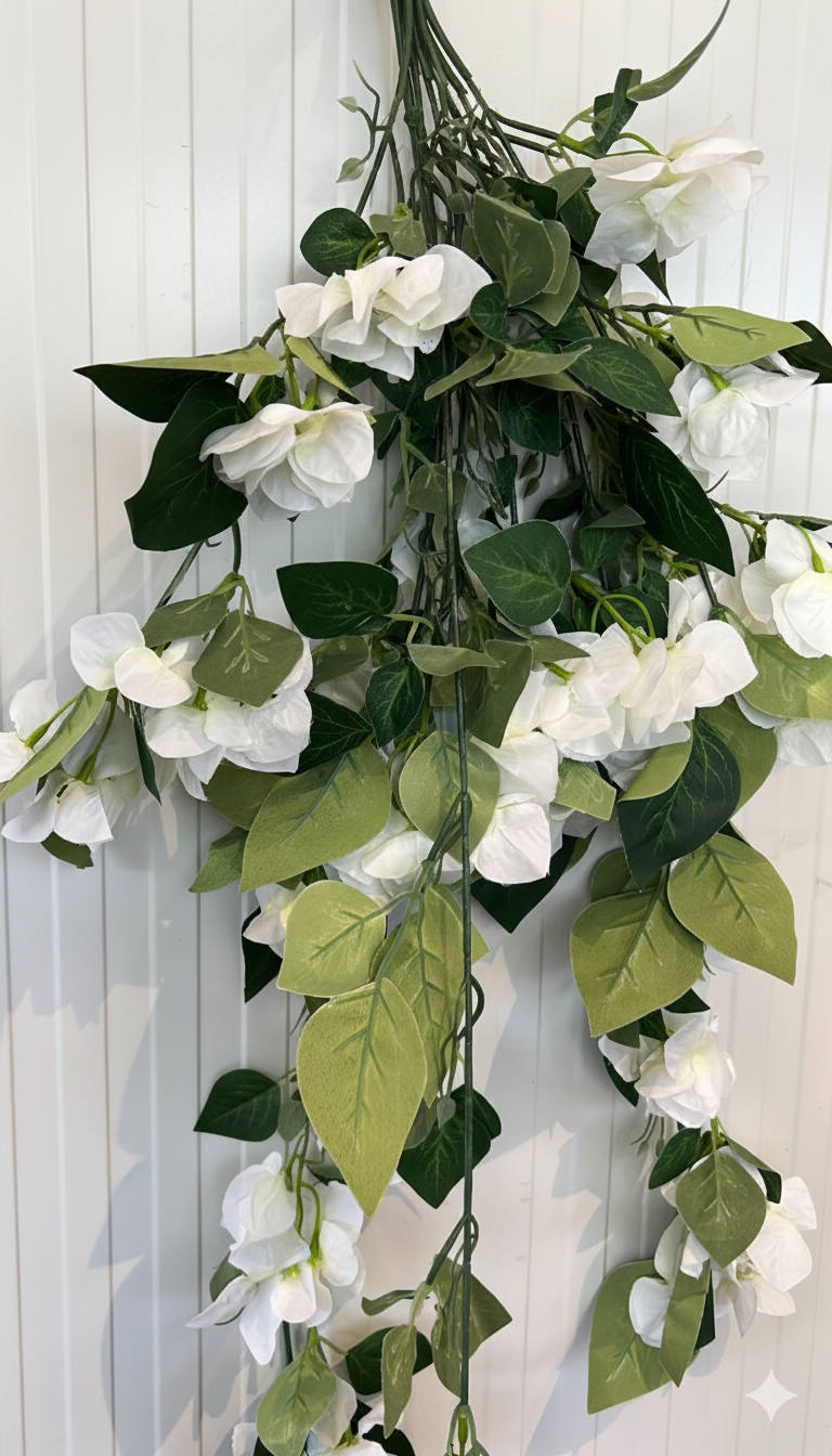 Lush artificial hanging plant featuring clusters of delicate white bougainvillea flowers and realistic green foliage. Perfect for adding a fresh, elegant touch to indoor or covered outdoor spaces.