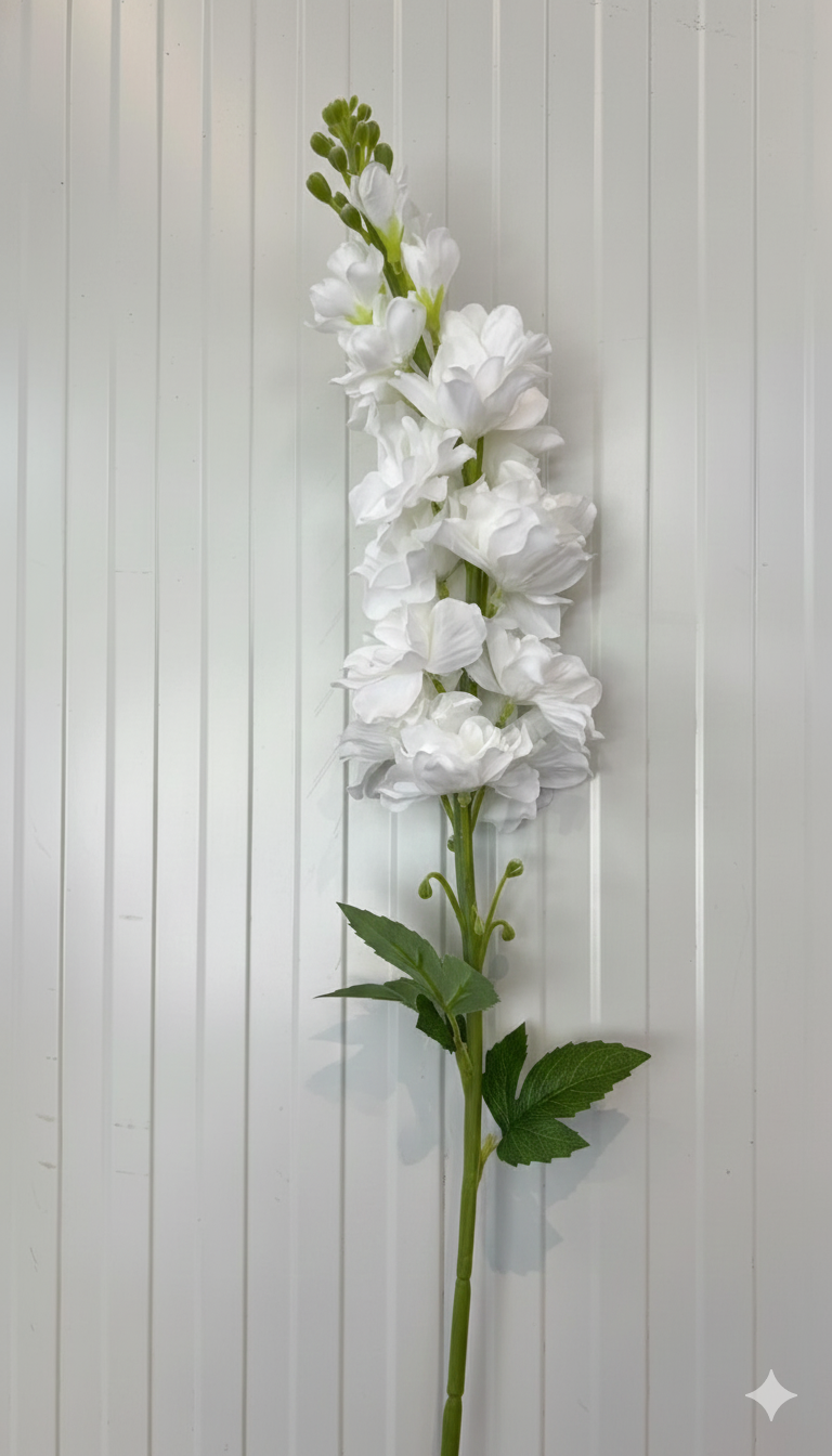 Tall, elegant artificial delphinium spray with pure white blooms and realistic green foliage. Perfect for adding height, sophistication, and classic beauty to wedding arrangements, large vases, or timeless home décor.