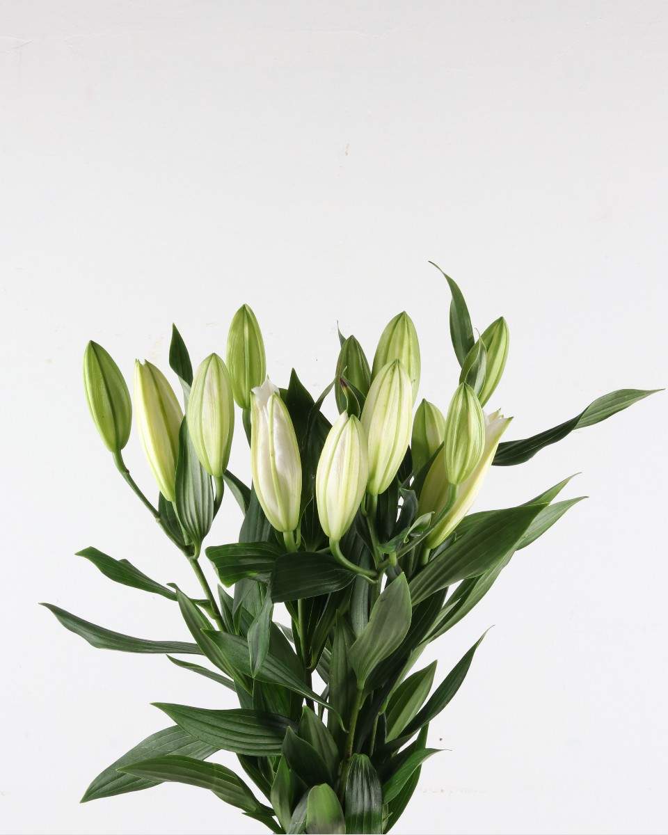 10 P Elegant bundle of pure white oriental lily buds with rich green foliage. Highly fragrant, long-lasting blooms that open into large, luxurious flowers – perfect for weddings and sophisticated arrangements.