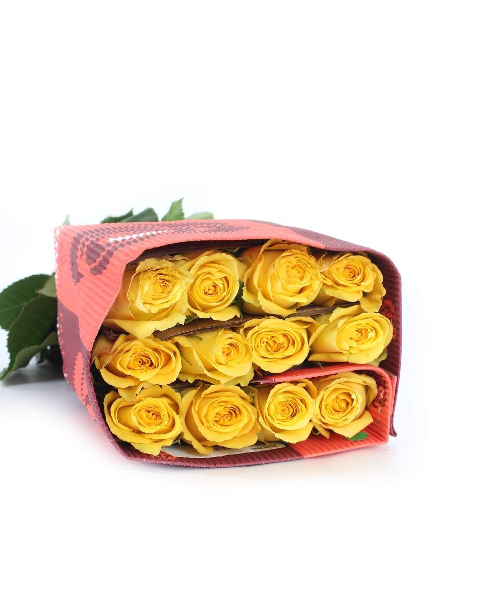 20 P vibrant yellow roses neatly wrapped in a stylish pink and purple patterned gift sleeve. Ready-to-gift bouquet perfect for celebrations, friendship, or brightening someone's day.